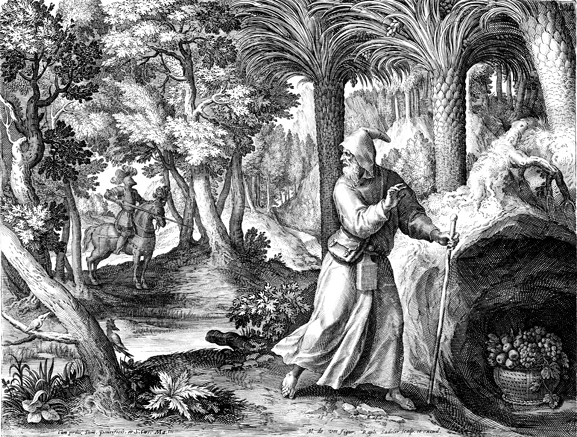Description: This image comes from “Oraculum Anachoreticum,” dated 1600, bound with “Solitudo, sive, Vitae patrum eremicolarum”. Saint Possidonius the Theban, a hermit near Bethlehem, hastens away from a knight. The names of the artist responsible for the design, Maarten De Vos, and the engraver, Raphael Sadeler I, are at the lower left.