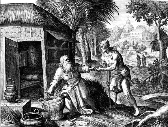 Description: This image comes from “Oraculum Anachoreticum,” dated 1600, bound with “Solitudo, sive, Vitae patrum eremicolarum”. Saint Lucius (first century) making a reed basket and giving alms to a crippled beggar. The names of the artist responsible for the design, Maarten De Vos, and the engraver, Johannes Sadeler I (Jan Sadeler), are at the base.