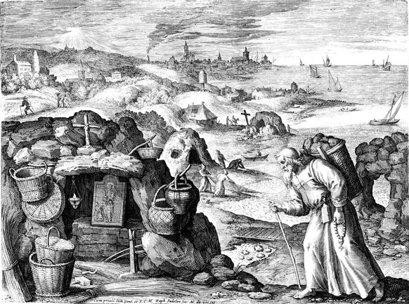 Description: This image comes from “Oraculum Anachoreticum,” dated 1600, bound with “Solitudo, sive, Vitae patrum eremicolarum”. Saint Dorotheus, bishop of Tyre (ca. 255 – 362) returns to rock dwelling on the seashore with a basket of rocks on his back. The names of the artist responsible for the design, Maarten De Vos, and the engraver, Raphael Sadeler I, are at the base.