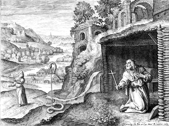 Description: This image comes from “Oraculum Anachoreticum,” dated 1600, bound with “Solitudo, sive, Vitae patrum eremicolarum”. Saint Liphardus (d. 550) kneels in his woven shelter and holds a cross. The names of the artist responsible for the design, Maarten De Vos, and the engraver, Raphael Sadeler I, are at the lower right.