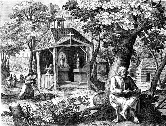 Description: This image comes from “Oraculum Anachoreticum,” dated 1600, bound with “Solitudo, sive, Vitae patrum eremicolarum”. Saint Leonardus (d. 559)reading the scriptures under the shade of a tree.The names of the artist responsible for the design, Maarten De Vos, and the engraver, Johannes Sadeler I (Jan Sadeler), are at the lower left.