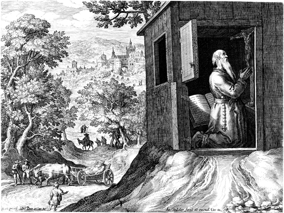 Description: This image comes from “Oraculum Anachoreticum,” dated 1600, bound with “Solitudo, sive, Vitae patrum eremicolarum”. Saint Auxentius of Bithynia (d. 473) prays before a crucifix in a wooden cabin. The names of the artist responsible for the design, Maarten De Vos, and the engraver, Johannes Sadeler I (Jan Sadeler), are at the base.