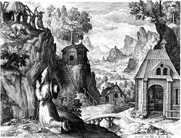 Description: This image comes from “Oraculum Anachoreticum,” dated 1600, bound with “Solitudo, sive, Vitae patrum eremicolarum”. Saint Landelinus (c.625-686) prays at a spring while monks construct huts on the cliffs above. The names of the artist responsible for the design, Maarten De Vos, and the engraver, Johannes Sadeler I (Jan Sadeler), are at the lower left.