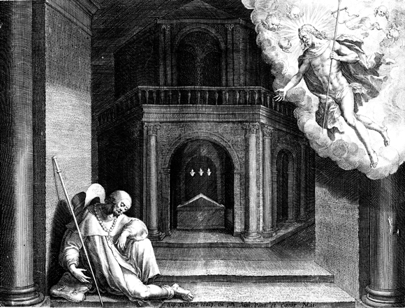 Description: This image comes from “Oraculum Anachoreticum,” dated 1600, bound with “Solitudo, sive, Vitae patrum eremicolarum”. Saint Petrus dreams of a visit from Jesus Christ.The names of the artist responsible for the design, Maarten De Vos, and the engraver, Raphael Sadeler I, are at the base.