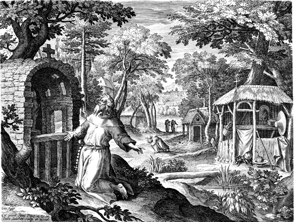 Description: This image comes from “Oraculum Anachoreticum,” dated 1600, bound with “Solitudo, sive, Vitae patrum eremicolarum”. Saint Theobaldus prays before a chapel int he woods while other monks tend a garden. The names of the artist responsible for the design, Maarten De Vos, and the engraver, The names of the artist responsible for the design, Maarten De Vos, and the engraver, Johannes Sadeler I (Jan Sadeler), are at the lower left.