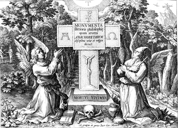 Description: This image comes from “Sylvae Sacrae,” dated 1594, bound with “Solitudo, sive, Vitae patrum eremicolarum”. Two angels flank a stone cross and a skull and crossbones. The angel on the left holds a rosary and while a book labeled PRECATIO rests on the ground ("praying"). The angel on the right is hooded and holds whips while a plated labeled ABSTINETIA ("abstain")rests on the ground. The name of the artist responsible for the design, Maarten De Vos is at the lower right and the name of the engraver, Johannes Sadeler I (Jan Sadeler), is at the lower left.