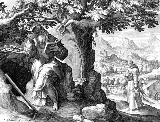 Description: This image comes from “Sylvae Sacrae,” dated 1594, bound with “Solitudo, sive, Vitae patrum eremicolarum”. Saint Epiphanius (left) reads the scriptures with a hoe in front of him, while another monk gathers vegetables. The names of the artist responsible for the design, Maarten De Vos, and the engraver, Johannes Sadeler I (Jan Sadeler), are at the lower left.