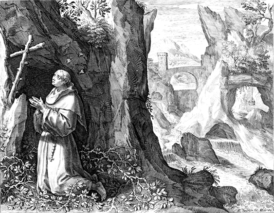 Description: This image comes from “Sylvae Sacrae,” dated 1594, bound with “Solitudo, sive, Vitae patrum eremicolarum". Saint Benedictus (5th century) prays at the foot of a homemade cross. The names of the artist responsible for the design, Maarten De Vos, and the engraver, Raphael Sadeler I, are at the lower right.