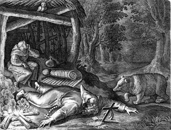 Description: This image comes from “Sylvae Sacrae,” dated 1594, bound with “Solitudo, sive, Vitae patrum eremicolarum”. Saint Gall (c. 550 – c. 646) prays before a cross as a bear brings wood to feed the fire. The names of the artist responsible for the design, Maarten De Vos, and the engraver, Raphael Sadeler I, are at the lower left.