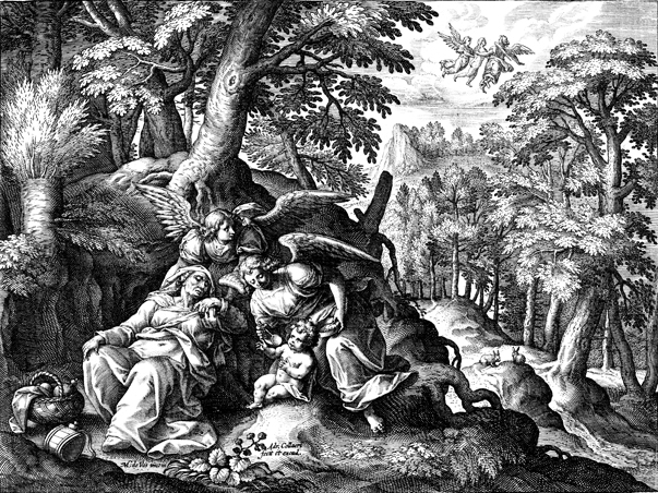Description: This image comes from “Solitudo sive vitae Foeminarum Anachoritarum,” by Adriaen and Joan Collaert and Cornelius Galle, bound with “Solitudo, sive, Vitae patrum eremicolarum”. Angels minister to Saint Elizabeth and feed the infant John the Baptist. The names of the artist responsible for the design, Maarten De Vos, and the engraver, Adriaen Collaert, are at the base.