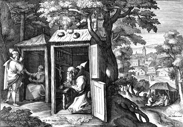 Description: This image comes from “Solitudo sive vitae Foeminarum Anachoritarum,” by Adriaen and Joan Collaert and Cornelius Galle, bound with “Solitudo, sive, Vitae patrum eremicolarum”. Saint Abraham prays for his niece, Mary, as she is seduced from the pious life by a wicked monk (left). People seek healing from touching Abraham's body and garments as he lies dying (right background). The names of the artist responsible for the design, Maarten De Vos, and the engraver, Cornelius Galle, are at the base. The name of the printer, Adriaen Collaert, appears at the lower right.