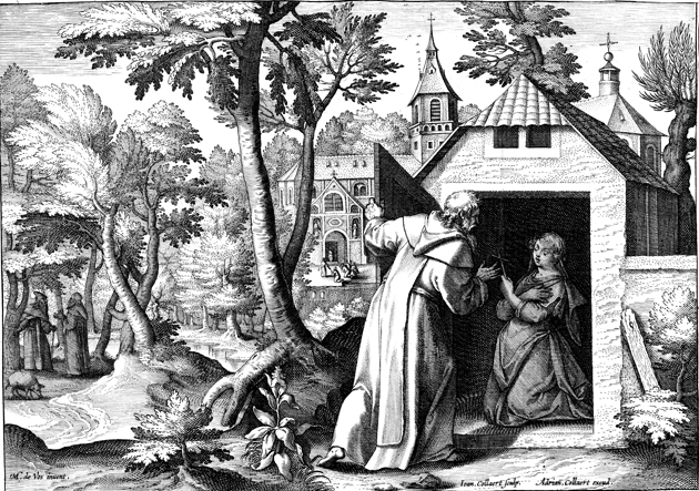 Description: This image comes from “Solitudo sive vitae Foeminarum Anachoritarum,” by Adriaen and Joan Collaert and Cornelius Galle, bound with “Solitudo, sive, Vitae patrum eremicolarum”. Saint Thais (4th century) prays as a monk approaches to convert her. The name of the artist responsible for the design, Maarten De Vos, is at the lower left and the names of the engraver, Jan Collaert, and the printer Adriaen Collaert, are at the lower right.
