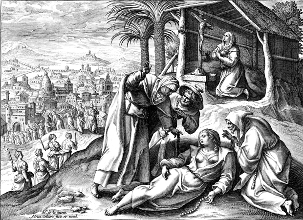 Description: This image comes from “Solitudo sive vitae Foeminarum Anachoritarum,” by Adriaen and Joan Collaert and Cornelius Galle, bound with “Solitudo, sive, Vitae patrum eremicolarum”. Saint Pelagia (5th century), an actress who chose a life of seclusion and penitence upon her conversion, prays. The names of the artist responsible for the design, Maarten De Vos, and the engraver, Adriaen Collaert, are at the lower left.