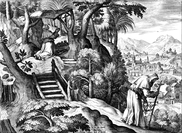 Description: This image comes from “Solitudo sive vitae Foeminarum Anachoritarum,” by Adriaen and Joan Collaert and Cornelius Galle, bound with “Solitudo, sive, Vitae patrum eremicolarum”. Nephalia Gnossia prays as a sister nun makes her way to the village. The names of the artist responsible for the design, Maarten De Vos, and the engraver, Adriaen Collaert, are at the base.