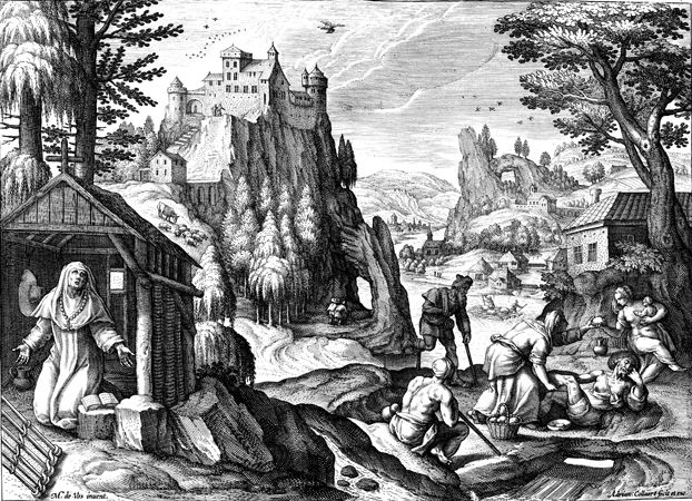 Description: This image comes from “Solitudo sive vitae Foeminarum Anachoritarum,” by Adriaen and Joan Collaert and Cornelius Galle, bound with “Solitudo, sive, Vitae patrum eremicolarum.” Ivetta of Liege prays in a chapel (left) and ministers to lepers (right). The name of the artist responsible for the design, Maarten De Vos, appears at the lower left and the name of the engraver, Adriaen Collaert, appears at the lower right .
