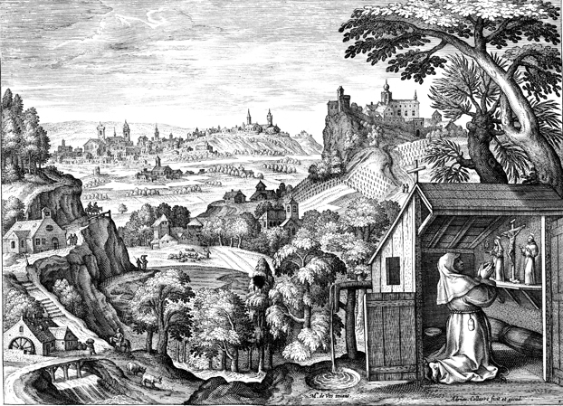 Description: This image comes from “Solitudo sive vitae Foeminarum Anachoritarum,” by Adriaen and Joan Collaert and Cornelius Galle, bound with “Solitudo, sive, Vitae patrum eremicolarum”. Saint Coleta prays before a crucifix flanked by icons of male and female saints. The name of the artist responsible for the design, Maarten De Vos, appears at the bottom center and the name of the engraver, Adriaen Collaert, appears at the lower right.