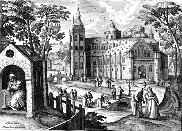 Description: This image comes from “Solitudo sive vitae Foeminarum Anachoritarum,” by Adriaen and Joan Collaert and Cornelius Galle, bound with “Solitudo, sive, Vitae patrum eremicolarum”. Maria Oigniacensis prays alone in a small chapel next to a large church by a river spanned by two bridges. The names of the artist responsible for the design, Maarten De Vos, and the engraver, Adriaen Collaert, are at the lower left.