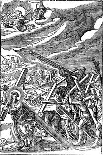 Description: Disciples bearing crosses follow Jesus, who also bears a cross, as God watches from above. Includes the monogram of the woodcutter, Christoffel van Sichem II (1577-1658) in the bottom left corner; his son, Christoffel van Sichem III (1618-1659), may have collaborated with him on these images .