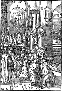 Description: As preacher delivers his sermon to the congregation, a man prays in secret (background, right) and the Eucharist is served in front of an altar triptych (left). Includes the monogram of the woodcutter, Christoffel van Sichem II (1577-1658); his son, Christoffel van Sichem III (1618-1659), may have collaborated with him on these images. The image also includes the monogram of the engraver (M) in the bottom left corner.