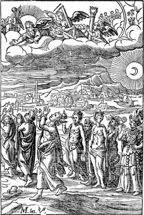 Description: Three men, who are praying, are tempted by three women, one who is dressed in fancy robes. Behind the women are two devils. At the top, angles hold a pillar, cross, spear, and sponge on a branch. Includes the monogram of the woodcutter, Christoffel van Sichem II (1577-1658); his son, Christoffel van Sichem III (1618-1659), may have collaborated with him on these images. The image also includes the monogram of the engraver (M) in the bottom left corner.