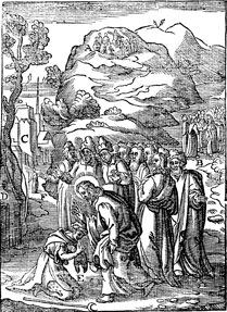 Description: Jesus heals the leper after returning from the mountain. Includes the monogram of the woodcutter, Christoffel van Sichem II (1577-1658); his son, Christoffel van Sichem III (1618-1659), may have collaborated with him on these images.