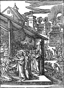 Description: Jesus heals in Peter's house, as the sun sets. Includes the monogram of the woodcutter, Christoffel van Sichem II (1577-1658) near the letter G (left); his son, Christoffel van Sichem III (1618-1659), may have collaborated with him on these images.