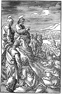 Description: Jesus selects 12 disciples who go out in pairs to preach. The two disciples have halos. Includes the monogram of the woodcutter, Christoffel van Sichem II (1577-1658) at the feet of the disciple; his son, Christoffel van Sichem III (1618-1659), may have collaborated with him on these images .