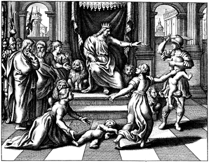 Description: Solomon appears on his throne as two women approach, both claiming custody of a baby. Solomon's servant stands with drawn sword to divide the child between the two women.