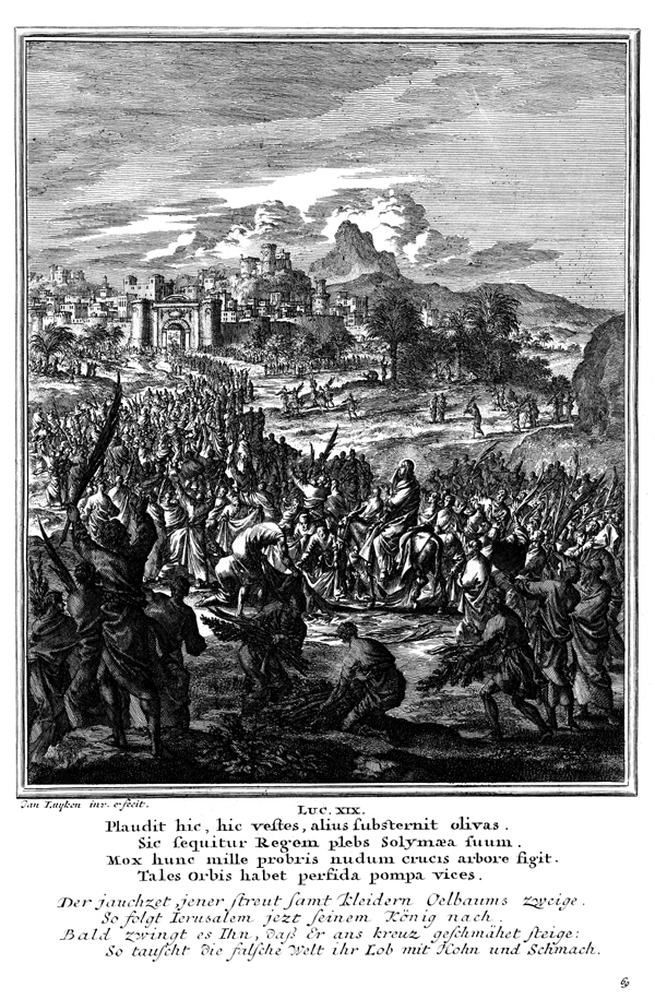 Description: Jesus rides into Jerusalem on a donkey to the waving of palm branches.