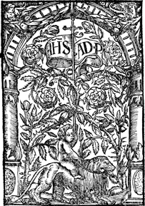 Description: The printer's device of Adam Petri (1454-1527) includes a child riding a lion and under a banner with the abbreviations IHS (Jesus) and AD.P (Adam Petri). Woodcut design after Hans Holbein, the Younger, perhaps by Hans Herman (see Hollstein, German Engravings, XIV:182).