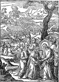 Description: The disciples feed a crowd of five thousand with five loaves of bread and two fish. A boy who had the basket of bread and fish stands behind Jesus. Includes the monogram of the woodcutter, Christoffel van Sichem II (1577-1658); his son, Christoffel van Sichem III (1618-1659), may have collaborated with him on these images. This image also includes an engraver’s knife near the bottom left corner.