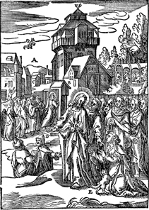 Description: A Canaanite woman in the region of Tyre and Sidon kneels before Jesus, requesting that he heal her daughter. A dog represents the content of their conversation. In the background over the letter A, a demon flies away. Includes the monogram of the woodcutter, Christoffel van Sichem II (1577-1658); his son, Christoffel van Sichem III (1618-1659), may have collaborated with him on these images.