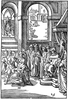 Description: Jesus gives an illustration to demonstrate the law of forgiveness. A slave pleads with his master to give him more time to repay his debt (top left). After the master shows pity and forgives his debt, the slave goes out and has a fellow slave who owes him a far less amount thrown into prison (top center). When the master hears of this, he has the slave handed over to be tortured until he repays his debt (base). Includes the monogram of the woodcutter, Christoffel van Sichem II (1577-1658) in the bottom right corner; his son, Christoffel van Sichem III (1618-1659), may have collaborated with him on these images.