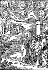 Description: Jesus prophesies about the passion. The passion scenes are shown E-M. Includes the monogram of the woodcutter, Christoffel van Sichem II (1577-1658) on the left; his son, Christoffel van Sichem III (1618-1659), may have collaborated with him on these images.