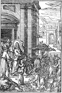 Description: Jesus turns over the table of the moneychangers. The children praise him while the scribes argue with him.