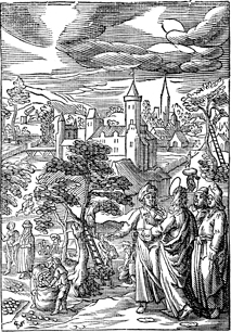 Description: Before the fig tree where figs are being gathered. This sets the scene for Jesus making the tree barren. Includes the monogram of the woodcutter, Christoffel van Sichem II (1577-1658); his son, Christoffel van Sichem III (1618-1659), may have collaborated with him on these images.
