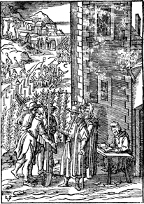 Description: The landowner sends his servants to the vineyard. In the near background the tenants murder the servants and son of the landowner of the vineyard, while in the far background is the crucifixion of Jesus with two sinners. Includes the monogram of the woodcutter, Christoffel van Sichem II (1577-1658)in the bottom left corner; his son, Christoffel van Sichem III (1618-1659), may have collaborated with him on these images.