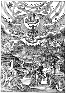 Description: The universal significance of Jesus coming is depicted with activity on earth among the saved who gather in heaven and the doomed. Stars fall from the sky and winds blow.
