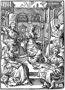 Description: The five wise virgins are calmly waiting, preparing for the arrival of the bridegroom. Includes the monogram of the woodcutter, Christoffel van Sichem II (1577-1658) in the bottom left corner; his son, Christoffel van Sichem III (1618-1659), may have collaborated with him on these images.