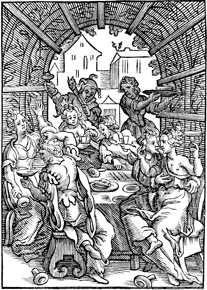 Description: With their empty lamps at the foreground floor, the five foolish virgins are drinking to excess and one is carousing with a man. The clown in the background lends to the air of foolish distress. Includes the monogram of the woodcutter, Christoffel van Sichem II (1577-1658) at the head; his son, Christoffel van Sichem III (1618-1659), may have collaborated with him on these images.