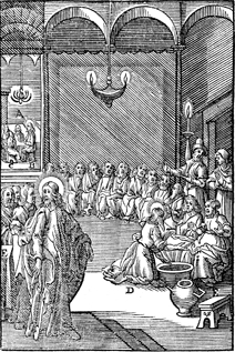 Description: Jesus washes the disciples' feet (lower right) and eats the last supper with them (upper left). The monogram of the artist,Christoffel van Sichem (1546-1624) appears on the bench at the lower right.