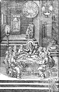 Description: Jesus institutes the Eucharist with the disciples. Includes the monogram of the woodcutter, Christoffel van Sichem II (1577-1658); his son, Christoffel van Sichem III (1618-1659), may have collaborated with him on these images.