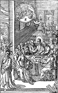 Description: Jesus tells his disciples that one of them will betray Him. Judas, with the devil on his head, walks away. Includes the monogram of the woodcutter, Christoffel van Sichem II (1577-1658); his son, Christoffel van Sichem III (1618-1659), may have collaborated with him on these images. The image also includes an engraver’s knife in the bottom right corner.