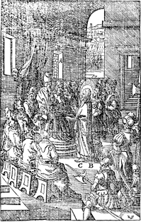 Description: Jesus defends himself before the high priest Caiaphas. Includes the monogram of the woodcutter, Christoffel van Sichem II (1577-1658) in lower right corner of image; his son, Christoffel van Sichem III (1618-1659), may have collaborated with him on these images.