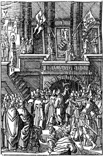 Description: Jesus is brought to Pilate, as he addresses the crowds from his balcony. Includes the monogram of the woodcutter, Christoffel van Sichem II (1577-1658) in the top left corner; his son, Christoffel van Sichem III (1618-1659), may have collaborated with him on these images.