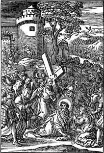 Description: Simon of Cyrene is ordered to carry Jesus' cross after Jesus falls under its weight. Includes the monogram of the woodcutter, Christoffel van Sichem II (1577-1658) in the top left corner; his son, Christoffel van Sichem III (1618-1659), may have collaborated with him on these images.