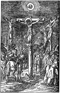 Description: As Jesus dies on the cross, a soldier pierces his side with a spear, another breaks the legs of one of the thieves with a club. At the base of the cross is a skull and over Jesus’ head is the inscription, “INRI.” Includes the monogram of the woodcutter, Christoffel van Sichem II (1577-1658); his son, Christoffel van Sichem III (1618-1659), may have collaborated with him on these images. This image also includes an engraver’s knife at the base.