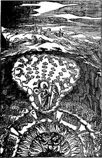 Description: The harrowing of Hell is depicted as Jesus descending into Hell surrounded by angels. The devil sits at the base as all the people in Hell kneel and worship Jesus. Includes the monogram of the woodcutter, Christoffel van Sichem II (1577-1658) near the head on the left; his son, Christoffel van Sichem III (1618-1659), may have collaborated with him on these images.