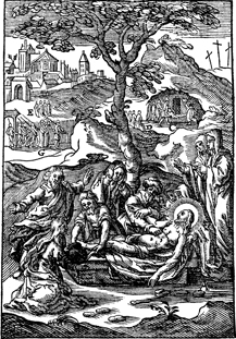 Description: Jesus is buried in the tomb of Joseph of Arimathea. Joseph wraps Jesus in linen cloth, while Mary Magdalene anoints him with oil. In the background are three crosses standing on the hill of Golgotha. Includes the monogram of the woodcutter, Christoffel van Sichem II (1577-1658) near the top left corner; his son, Christoffel van Sichem III (1618-1659), may have collaborated with him on these images.