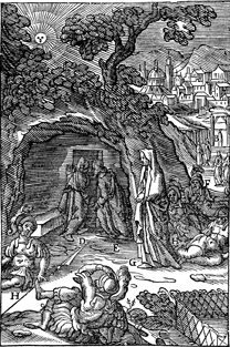 Description: Peter and the beloved disciple find Jesus’ tomb empty, as the soldiers guarding the tomb awaken. Includes the monogram of the woodcutter, Christoffel van Sichem II (1577-1658) near the base; his son, Christoffel van Sichem III (1618-1659), may have collaborated with him on these images.